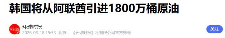 2026-03-18环球时报《韩国将从阿联酋引进1800万桶原油》