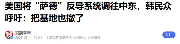 2026-03-11不雅察者网《好意思国将“萨德”反导系统调往中东,韩公共命令:把基地也撤了》