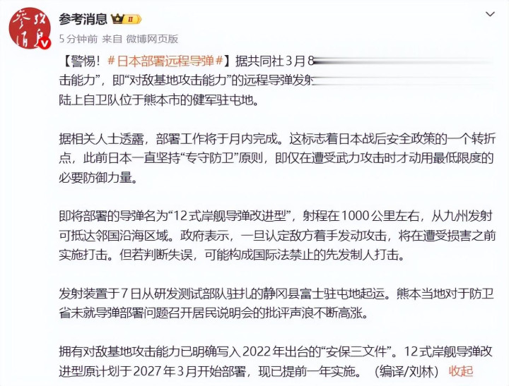 凭证日本共同社的最新报说念,这两天日本自保队在夜深暗暗行动,动用多辆军用运载车辆,将而已导弹辐照安装,隐走私抵其首个部署目标地,即陆上自保队位于熊本市的健军驻屯地。