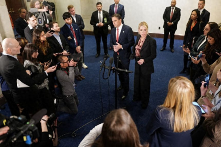 好意思国王法部长帕姆·邦迪与副王法部长托德·布兰奇周三下昼抵达国会山,正本但愿通过一场闭门简报,缓解外界对王法部措置杰弗里·爱泼斯坦案的质疑,并争取议员的信任。联系词,这场会议仅握续了不到半小时,便因民主党议员集体离场而飞速演变为一场热烈的政事突破。